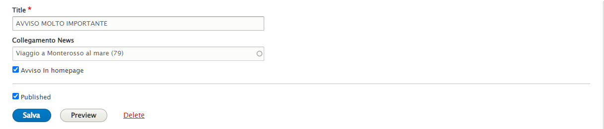 Scrivere il testo dell'avviso nel campo "Title". Per collegarlo ad una news pubblicata, digitare il titolo della news, o parte di esso, nel campo "Collegamento News" e selezionare la news che compare.