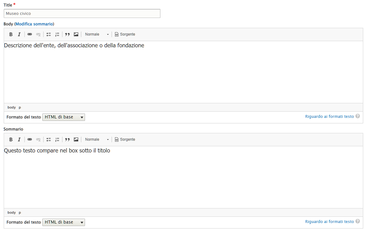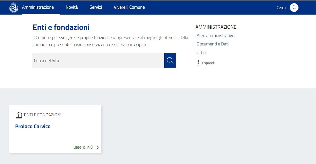 Questo contenuto permette di creare una pagina dedicata ad un Ente, una fondazione ma anche un'associazione cittadina, che verrà pubblicato sotto la voce "Amministrazione" del menù principale.