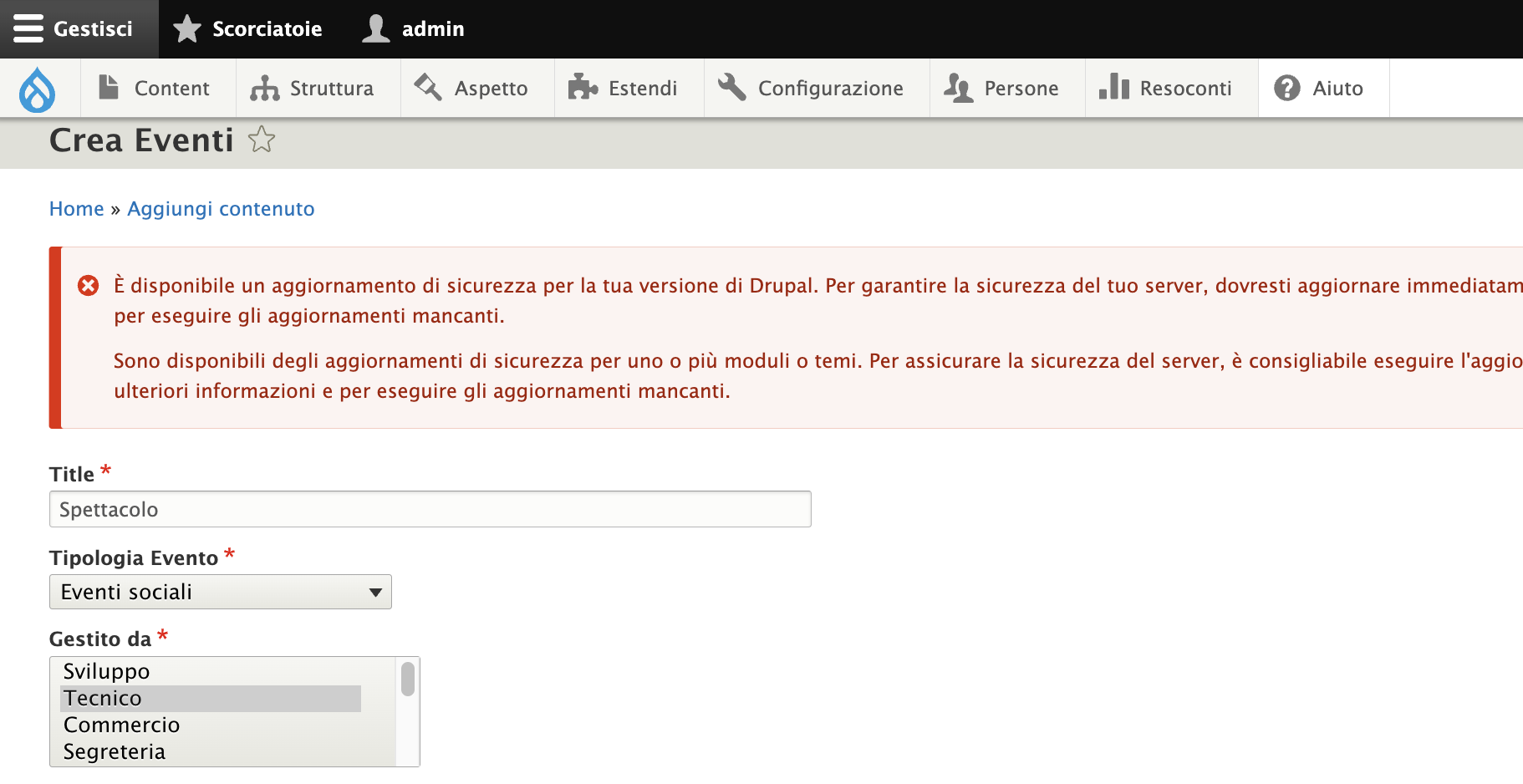 Questo contenuto permette di creare un evento che verrà pubblicato sotto la voce "Vivere il Comune" del menù principale e nel calendario in Homepage.