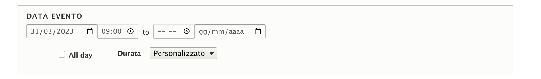 1. Nel caso in cui l'evento si svolga in un singolo giorno, indicare la data nel box "Giorni Evento" la data, l'orario di inizio e di fine oppure flaggare "All Day" nel caso in cui l'evento duri tutto il giorno