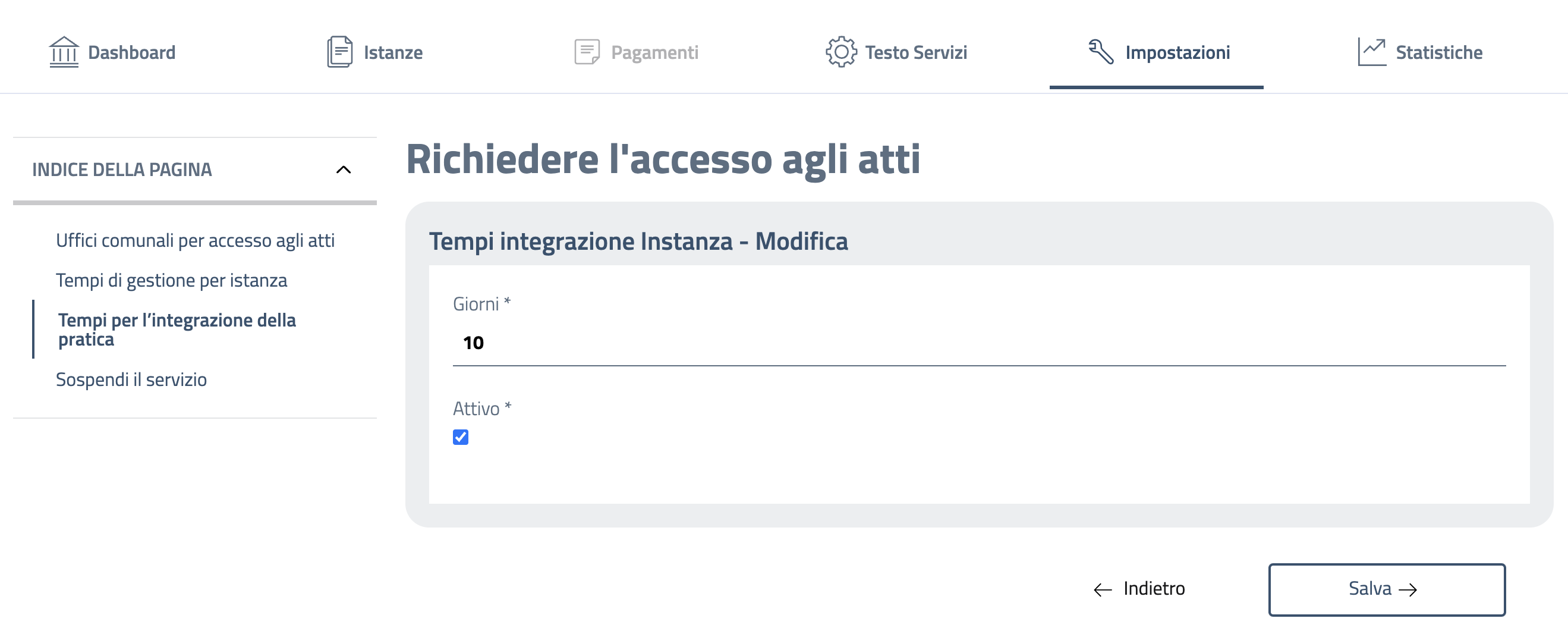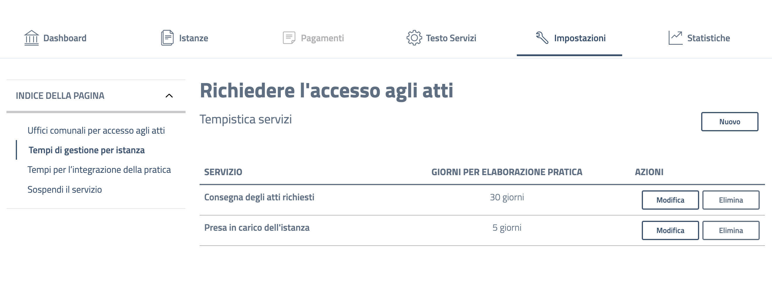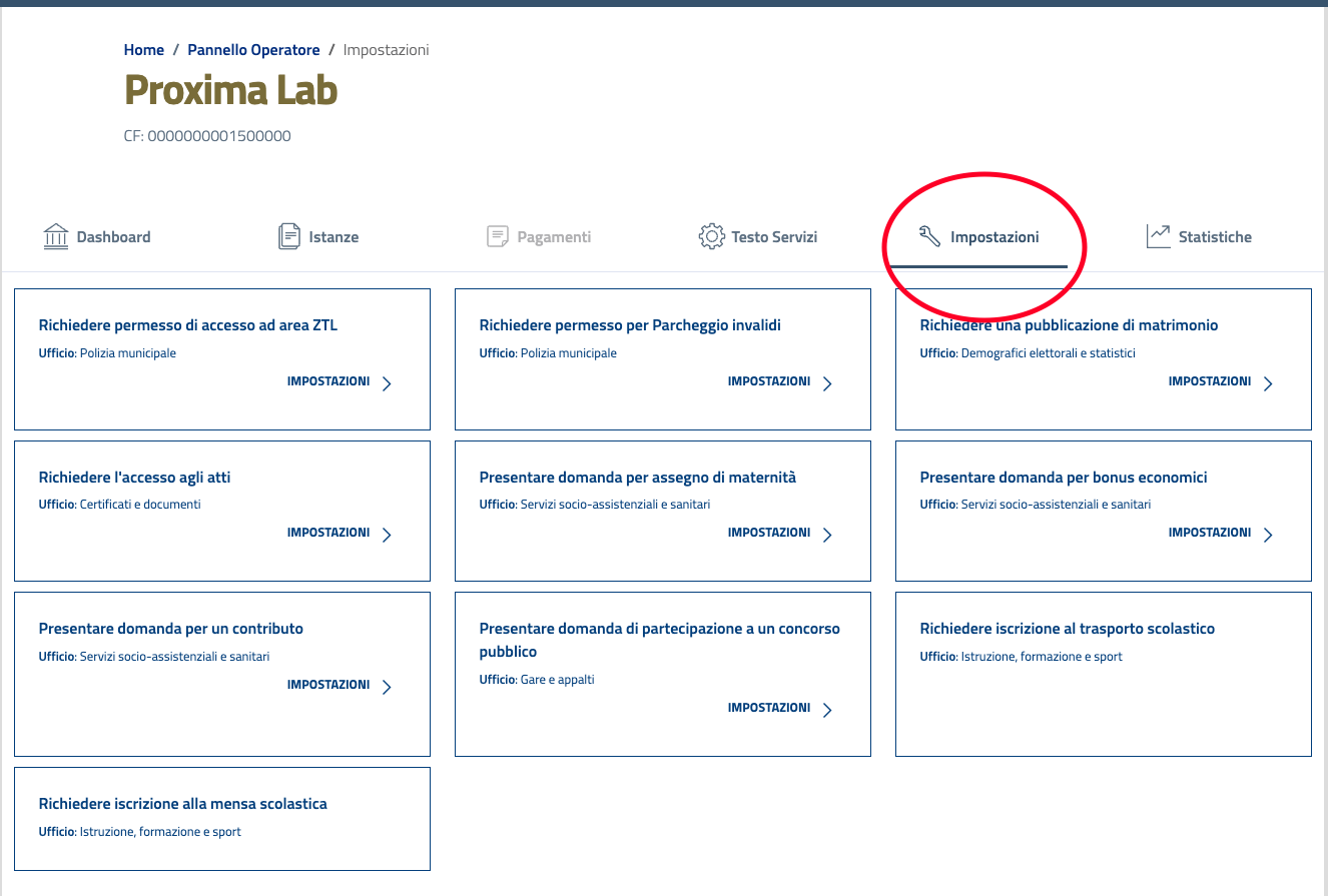 Cliccando su "Impostazioni" si accede alla sezione in cui è possibile modificare tutti i parametri dei singoli servizi, quali le diverse fasi dell'iter, i tempi per l'integrazione documentale e la loro attivazione o disattivazione.