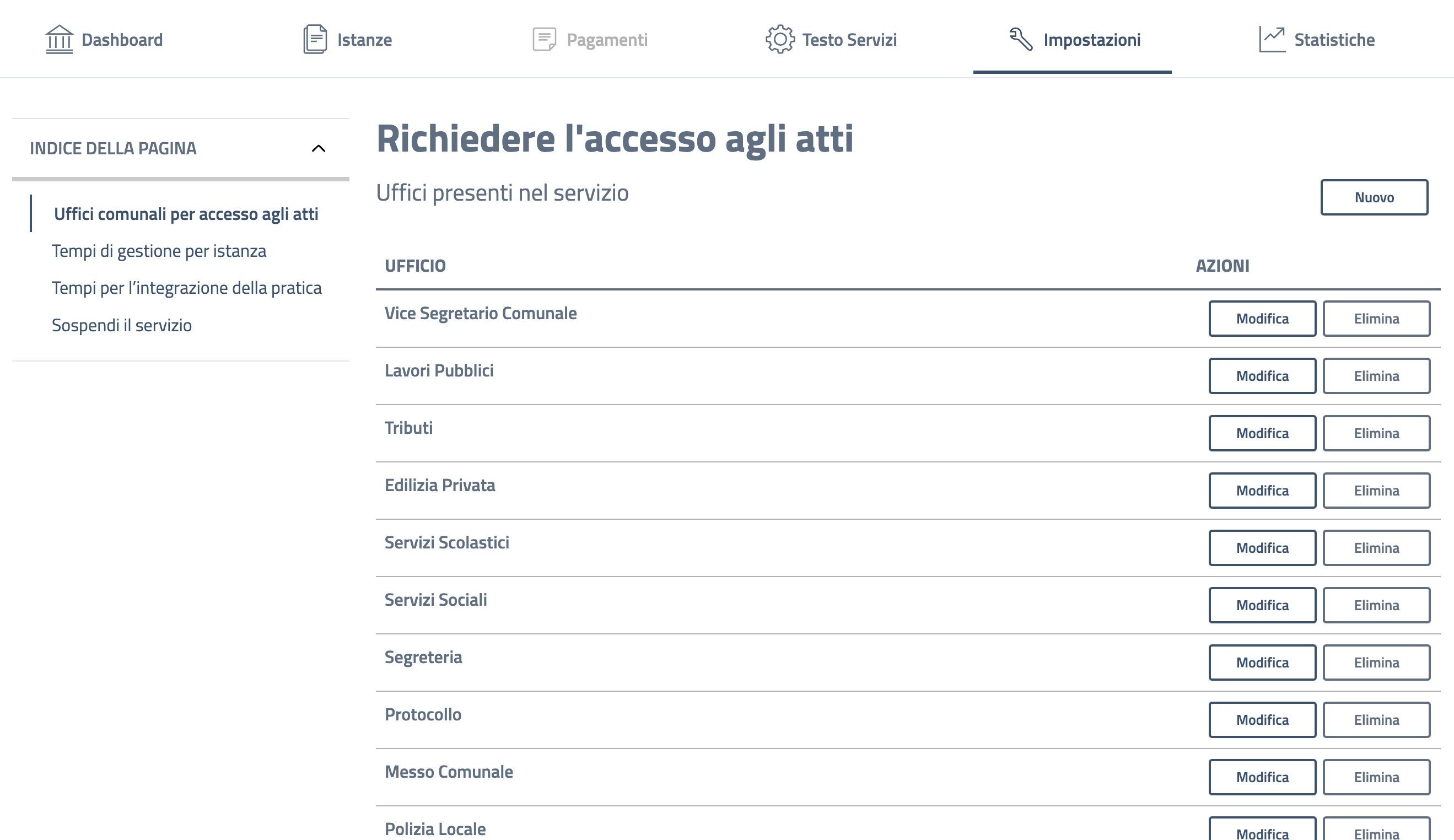 NB: Non tutte le voci sono presenti in tutti i servizi. Ad esempio la configurazione degli uffici a cui è possibile inviare l'istanza o la creazione di un'istanza personalizzata sono elementi facoltativi in base alle necessità del servizio.