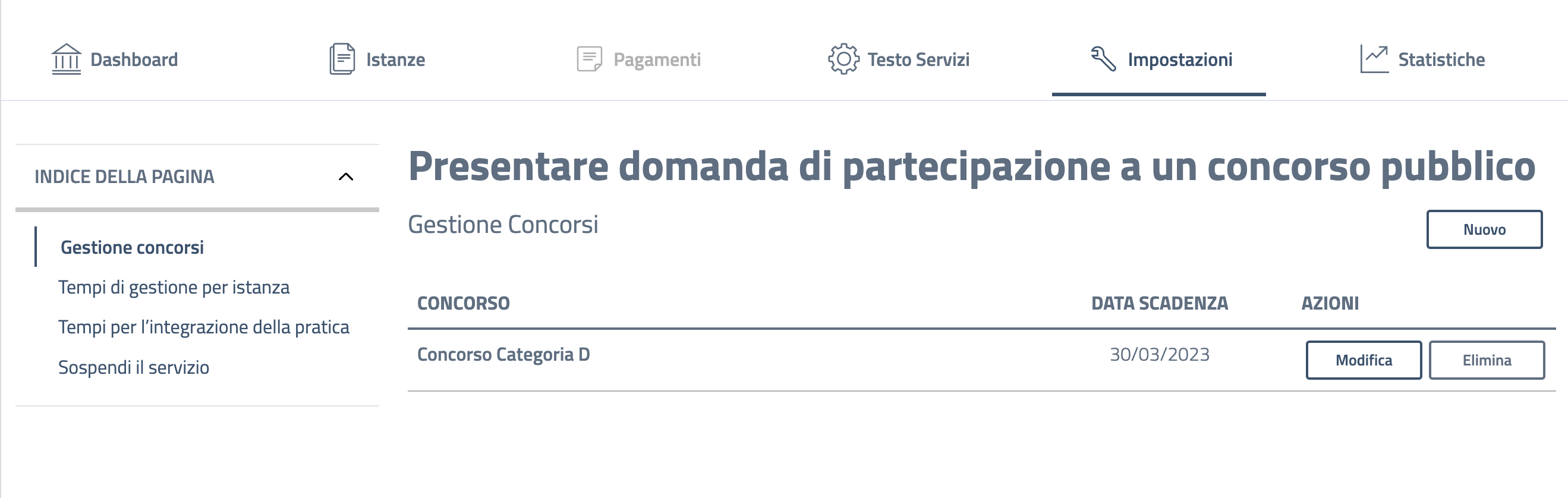 Gestione concorsi: questa opzione è una delle voci facoltativamente configurabili a seconda del servizio. Nel caso specifico permette di impostare per uno stesso servizio più istanze afferenti ad ambiti diversi. Nell'esempio riportato, per il servizio di presentazione di una domanda di partecipazione ad un concorso pubblico, è possibile configurare più concorsi contemporaneamente cliccando su "Nuovo".