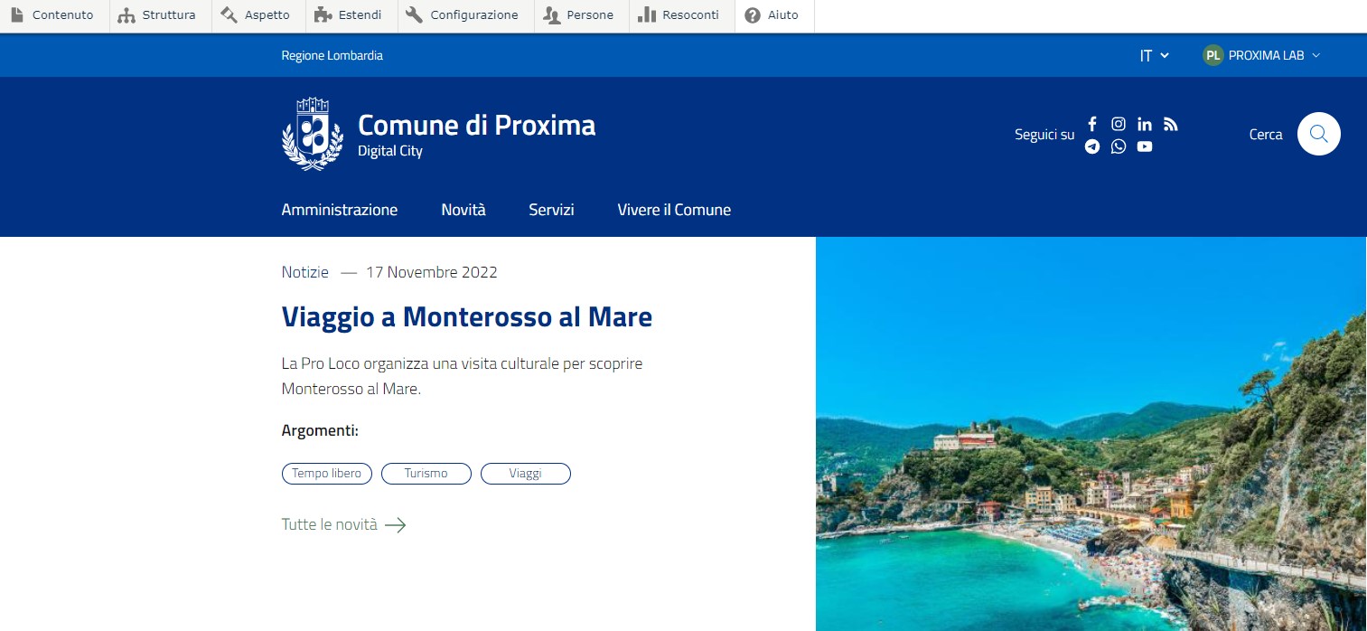 Questo contenuto permette di creare una News che verrà pubblicata sotto la voce "Novità" del menù principale e in Homepage.