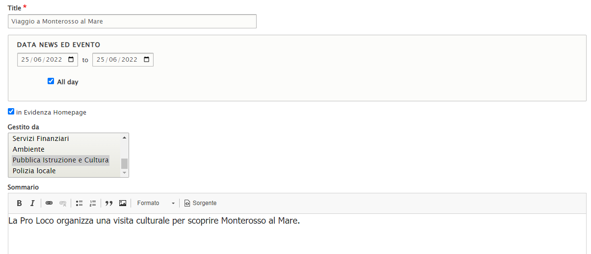 - sommario: una breve frase introduttiva alla news che comparirà nel box sotto il titolo