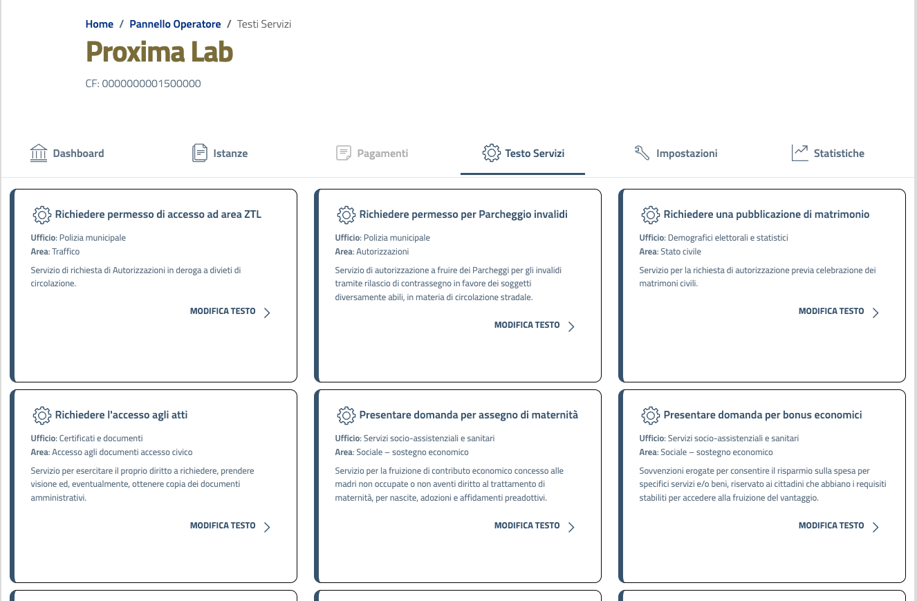 Cliccando su "Testo servizi" si accede alla sezione dedicata alla modifica dei testi descrittivi dei singoli servizi che l'utente troverà nel Pannello Utente.