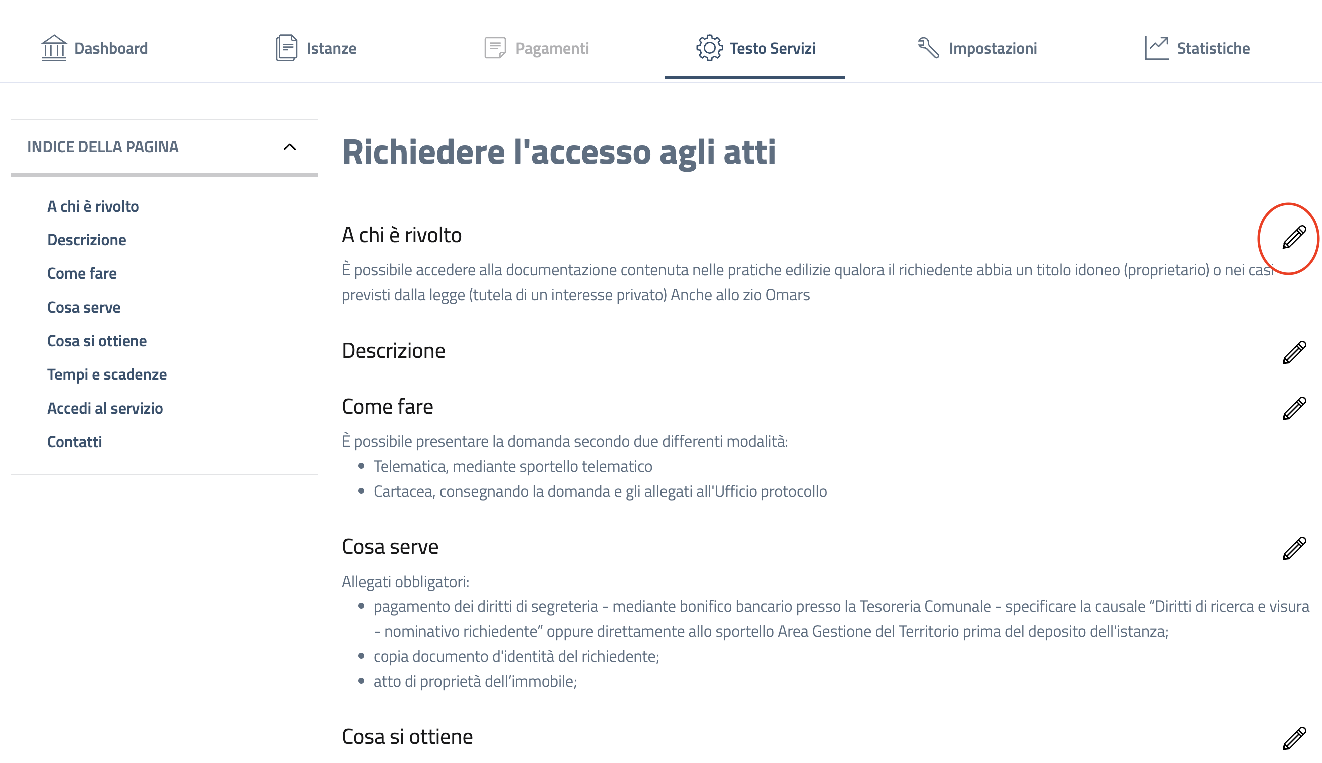 Cliccando su "Modifica Testo" si accede alla pagina del servizio in cui è possibile modificare ogni informazione cliccando sul simbolo della matita.